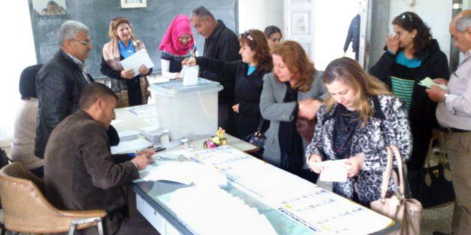 إقبال الناخبين إلى المركز الانتخابي بحي كرم الشامي في حمص لانتخاب ممثليهم في مجلس الشعب