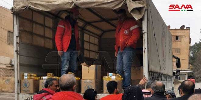 وزع فرع منظمة الهلال الأحمر العربي السوري في الحسكة مساعدات إغاثية وغذائية على الأسر التي استضافت عوائل نازحة من الأحياء الجنوبية لمدينة الحسكة خلال الأيام الماضية جراء الاشتباكات الحاصلة بين ميليشيا (قسد) وتنظيم (داعش) في محيط سجن الثانوية الصناعية.