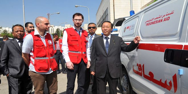 تسلمت منظمة الهلال الأحمر العربي السوري اليوم سيارتي إسعاف مقدمتين من الشعب الاندونيسي إلى الشعب السوري وذلك في مقر اللجنة العليا للإغاثة بوزارة الإدارة المحلية والبيئة.