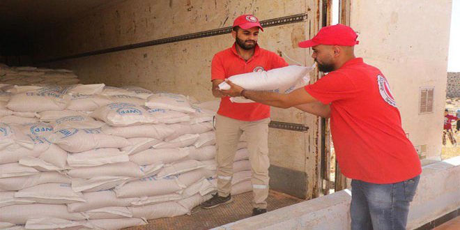 الهلال الأحمر يوصل 6487 سلة غذائية ومثلها أكياس طحين إلى اللجاة وبصر الحرير بريف درعا