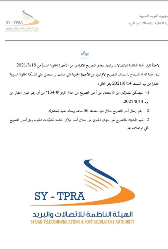 أعلنت الهيئة الناظمة للاتصالات والبريد استئناف التصريح الإفرادي عن الأجهزة الخلوية التي عملت أو ستعمل على الشبكة الخلوية السورية اعتباراً من يوم السبت 14-8-2021.