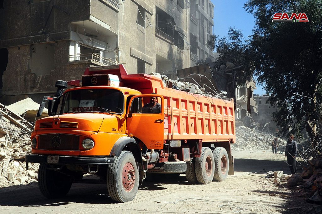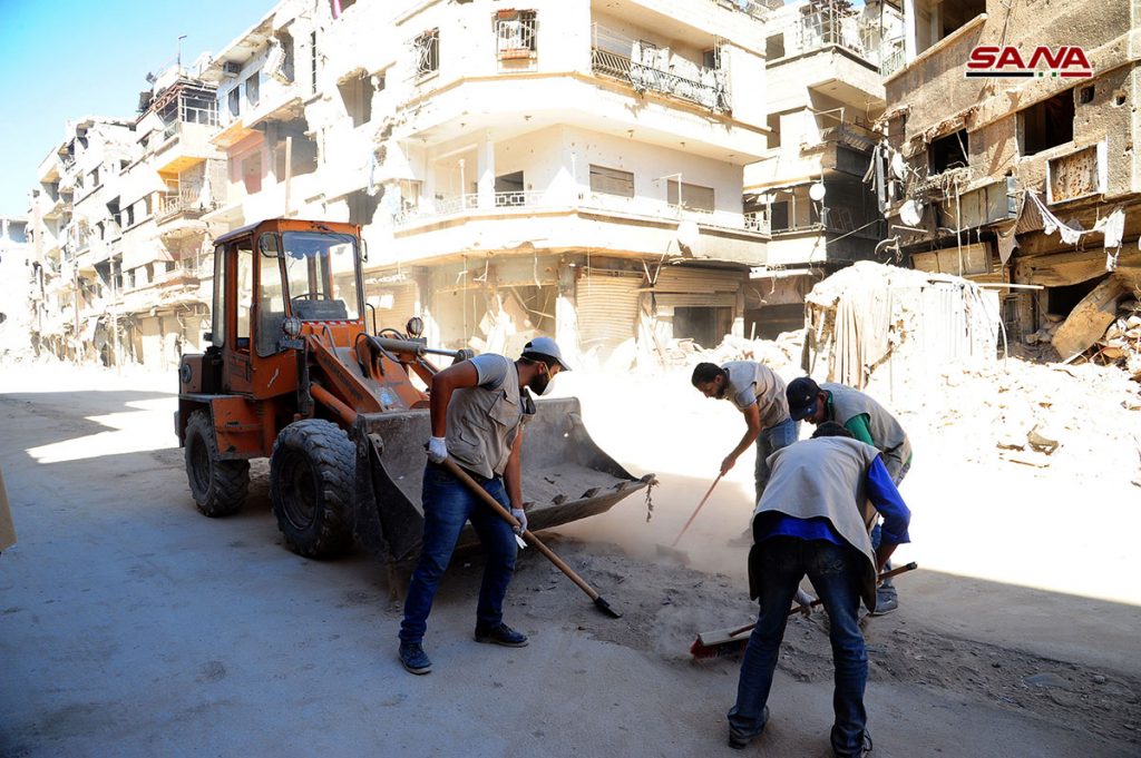 الورشات تواصل عملها في تنظيف شوارع مخيم اليرموك من مخلفات الإرهابيين