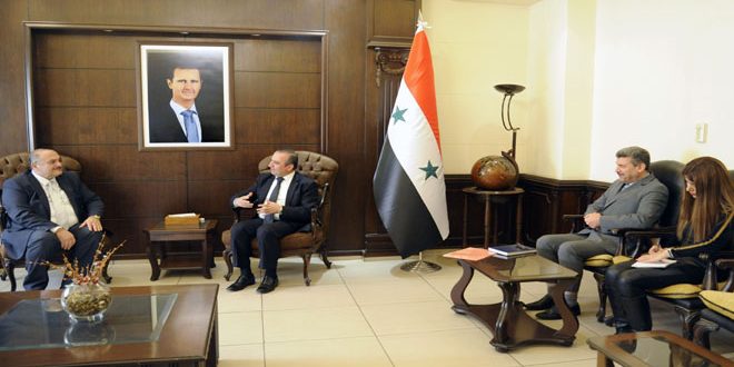 وشدد الوزير مخلوف خلال لقائه السفير زخيا اليوم على ضرورة تطوير التعاون المشترك بما يتوافق مع عمق الروابط والعلاقات التاريخية التي تجمع البلدين والشعبين الشقيقين مشيرا إلى أهمية تفعيل الاتفاقيات الموقعة بين الجانبين ودراسة تطويرها بالإضافة إلى مناقشة المواضيع والخطط والبرامج التي من شأنها تعزيز التنسيق والتعاون.