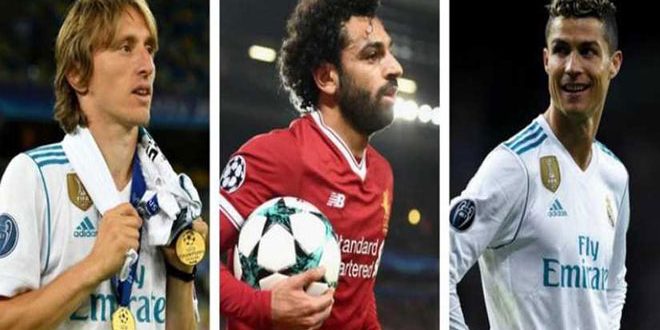 وضمت القائمة النجم البرتغالي كريستيانو رونالدو المنتقل حديثا من ريال مدريد إلى يوفنتوس وهداف نادي ليفربول الإنكليزي المصري محمد صلاح ومتوسط ميدان نادي ريال مدريد الكرواتي لوكا مودريتش.