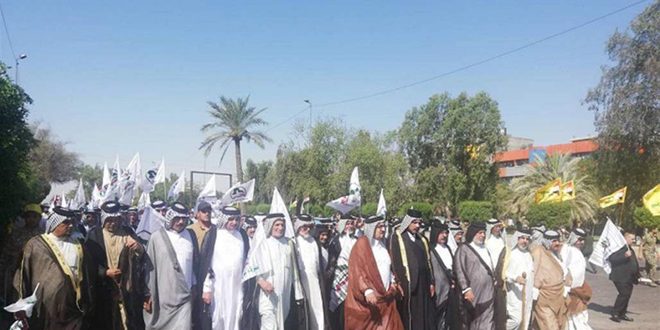 وذكر موقع السومرية نيوز أن المئات شاركوا في المسيرة التي انطلقت في منطقة شارع فلسطين شرق بغداد من بينهم شيوخ عشائر وفصائل من الحشد الشعبي ومسؤولون محليون وأعضاء برلمان.