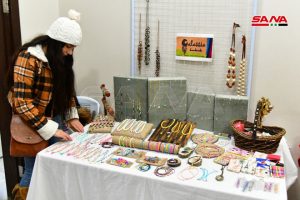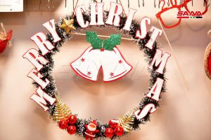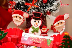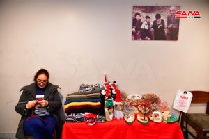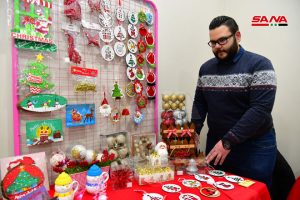 وفي البازار الميلادي الخيري الذي تقيمه كنيسة القديس باييسيوس الاثوسي في مدينة جرمانا بريف دمشق حتى الأحد القادم عرض حرفيون وشابات وسيدات هاويات مشغولات يدوية كلوازم عيد الميلاد والزينة بأشكال وألوان مختلفة وتحف وحلويات ومأكولات مصنوعة منزليا.
