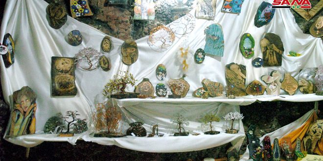تضمن البازار الأول لمعرض الغصن العتيق بمدينة السويداء الذي افتتح اليوم بمشاركة جمعيات ومشروعات صغيرة خاصة أعمالا فنية ويدوية متنوعة.