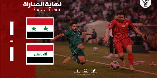 اختتم منتخب سورية لكرة القدم للرجال مشاركته في التصفيات الأسيوية المؤهلة إلى كأس العالم بالتعادل مع نظيره العراقي بهدف لمثله وذلك في المباراة التي جمعتهما اليوم في استاد راشد بنادي شباب الأهلي بدبي.