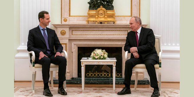 من جهته قال الرئيس الأسد: شكراً لكم سيادة الرئيس، وأنا سعيد اليوم أن أكون في موسكو ونلتقي لنناقش الكثير من الملفات المهمة المطروحة أمام الدولتين، صحيح أن اللقاءات بين المسؤولين لا تنقطع على مختلف المستويات، لكن التغيرات الدولية التي حصلت خلال العام الماضي تتطلب منا أن نلتقي ونضع تصورات مشتركة للمرحلة القادمة، مضيفاً: أتوجه بشكري لكم وللحكومة الروسية ممثلة بوزارة الطوارئ على المساعدات الكبيرة التي قدمت خلال الزلزال الذي أصاب سورية الشهر الماضي، وطبعاً لوزارة الدفاع والجيش الروسي الذي ساهم مساهمة مباشرة في إنقاذ المصابين جراء الزلزال، والذي كان له تأثيرٌ كبيرٌ في التخفيف عن المصابين وفي التخفيف من آثار الزلزال على المواطنين السوريين.