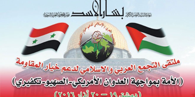 برعاية السيد الرئيس بشار الأسد تنطلق بعد غد السبت فعاليات ملتقى التجمع العربي والإسلامي لدعم خيار المقاومة تحت عنوان ” الأمة بمواجهة العدوان الأمريكي.. الصهيوتكفيري” بمشاركة 28 دولة عربية وإسلامية في دار الأسد للثقافة والفنون “الأوبرا” بدمشق.