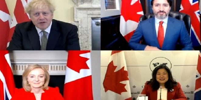 وفي بيان لوزارة التجارة البريطانية أوضحت وفق ما نقلت (ا ف ب) أنه في اتصال عبر الفيديو اليوم توصل رئيس الوزراء بوريس جونسون ورئيس الوزراء الكندي جاستن ترودو ورفقة وزيرة التجارة الدولية ليز تراس ونظيرتها الكندية ماري نغ إلى اتفاق مبدئي يجدد الاتفاق التجاري الحالي بين الاتحاد الأوروبي وكندا.