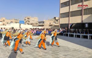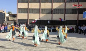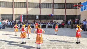 وخلال احتفالية الافتتاح قدمت فرقة الفنون الشعبية التابعة لدائرة المسرح المدرسي بحمص بإشراف المدربة رنا العبد الله، لوحات ورقصات فنية وفلكلورية وأغاني وطنية سورية وروسية.