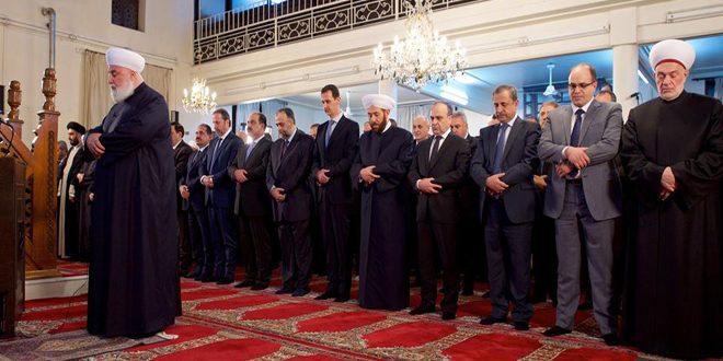 شارك السيد الرئيس بشار الأسد بالاحتفال الديني الذي أقامته وزارة الأوقاف مساء اليوم بذكرى مولد الرسول الكريم محمد صلى الله عليه وسلم في مسجد الأفرم بحي المهاجرين في دمشق حيث أدى صلاة العشاء مؤتماً بفضيلة الشيخ عدنان الأفيوني مفتي دمشق وريفها.
