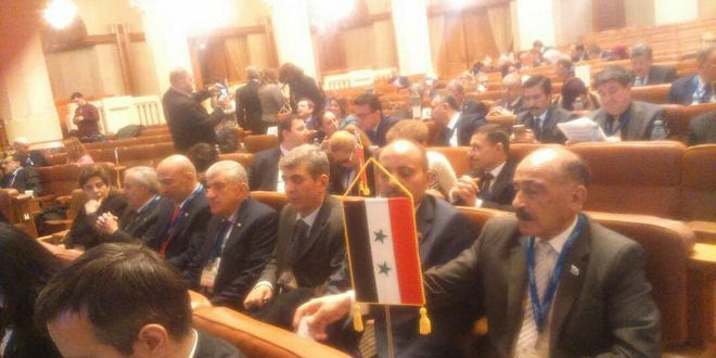 وأشار الدكتور حامد حسن عضو مجلس الشعب ورئيس الوفد السوري المشارك والذي يضم أيضا الأعضاء جرجس شنور وعبد حنان المحيمد وفيحاء طريفي ونضال الشريطي وحسين جاسم حمد في كلمة ألقاها أمام اللجنة إلى الحرب الإرهابية التي تشن على سورية والانتصارات التي حققها السوريون قيادة وشعبا على التنظيمات الإرهابية مبينا أن الإرهاب لا يهدد أمن سورية فقط بل يهدد أمن المنطقة والعالم بأسره ما يتطلب من جميع الدول وقفة واحدة ضد من يحميه ويدعمه ماليا ويقدم التسهيلات له.