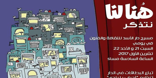 يستضيف مسرح الأوبرا بدار الأسد للثقافة والفنون عند الساعة السادسة من يومي ال 21 وال 22 من تشرين الأول الحالي الفعالية الثقافية الفنية “هنا لنا” التي تحمل في دورتها الثانية عنوان “نتذكر” بمشاركة كوكبة من نجوم الفن في سورية.