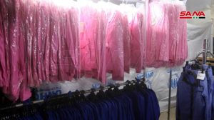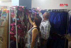 سمير الحلاق مندوب معمل ألبسة مدرسية قال شاركنا في السوق لمساعدة الناس في شراء اللباس المدرسي بسعر التكلفة تقريباً وتخفيف الأعباء المادية عليهم كمبادرة خيرية من المعمل.