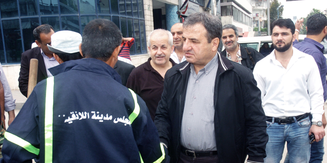 بمناسبة عيد العمال العالمي كرم محافظ اللاذقية ابراهيم خضر السالم اليوم عمال النظافة وهم يؤدون عملهم في شوارع المدينة وذلك تقديرا لجهودهم بالعمل والحفاظ على نظافتها ومظهرها الحضاري.
