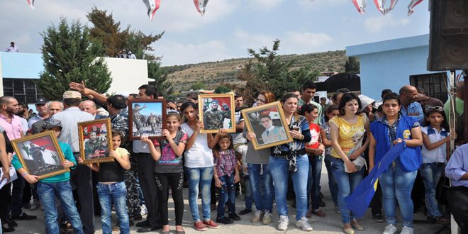 من جهتها اعربت هدى حسن من أبناء قرية المنقولة في كلمة ذوي الشهداء عن فخرها وجميع ذوي الشهداء بأبنائهم الذين رووا تراب سورية المقدس بطهر دمائهم لتزهر في المستقبل ورودا ورياحين يملا عبقها سماء الوطن معاهدة على المضي خلف القيادة الحكيمة والمسيرة الظافرة لجيشنا السوري الصامد في وجه الإرهاب.