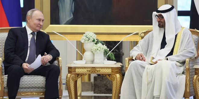 ونقل موقع (RT) عن بوتين قوله في محادثات مع الرئيس الإماراتي الشيخ محمد بن زايد آل نهيان في قصر الوطن بالعاصمة أبو ظبي: “إن العلاقات بين روسيا والإمارات وصلت إلى مستوى رفيع وغير مسبوق”، مؤكداً أن “أبو ظبي هي أكبر شريك تجاري لموسكو وتشارك في استثمارات ومشروعات كبرى في قطاعات النفط والغاز”.