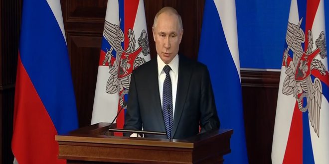 وقال بوتين في اجتماع موسع مع كادر وزارة الدفاع الروسية في موسكو اليوم إن مجموعة القوات الجوية الروسية والسفن الحربية وغواصات الأسطول الروسي المتمركزة في مطار حميميم والقاعدة البحرية في طرطوس تعتبر ضمانة لتحقيق الأمن والاستقرار.
