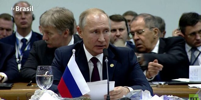 وقال بوتين في كلمة له أمام الجلسة العامة لقمة بريكس في البرازيل اليوم “إن من أهم المسائل التي نهتم بها هو بناء معايير دولية فيما يتعلق بمكافحة الإرهاب ومنع انتشار أيديولوجيته بما فيها عبر الانترنت كما نخطط للتعاون فيما يتعلق بغسل الأموال وتمويل الإرهاب وإعادة الأصول التي تم كسبها بأساليب إجرامية”.