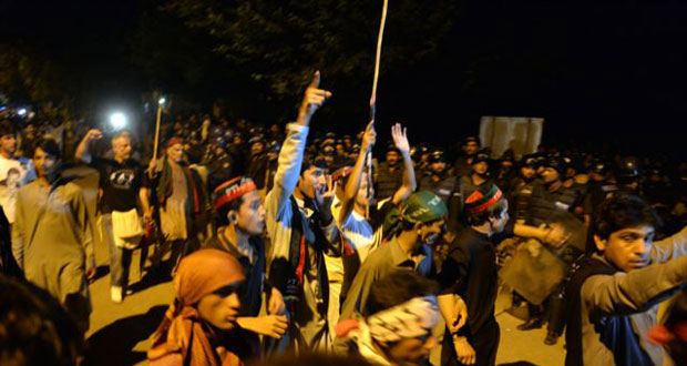 وفي هذه الأثناء حاول أكثر من ثلاثة آلاف متظاهر السير نحو مقر رئيس الوزراء نواز شريف حيث رشق المتظاهرون عناصر شرطة مكافحة الشغب بالحجارة كما قام بعضهم بتحطيم دراجات نارية مستخدمين هراوات من الخشب وحاولت الشرطة الرد من خلال الغاز المسيل للدموع إلا أن الأمطار أبطلت مفعوله.