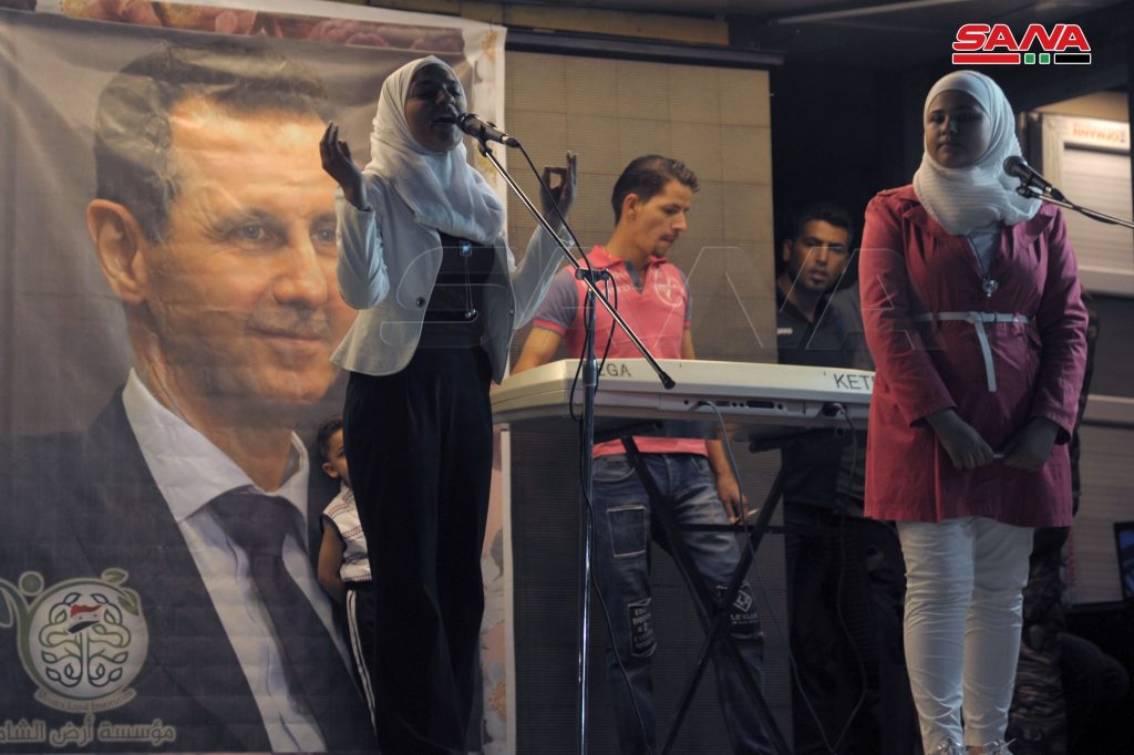 “ليس بالحب تصان الأوطان وإنما بالدم والروح” تحت هذا العنوان اجتمع أهالي مخيم الوافدين بريف دمشق مساء اليوم ضمن فعالية احتفاء بفوز الدكتور بشار الأسد بمنصب رئيس الجمهورية أقيمت بالتعاون مع مؤسسة أرض الشام.