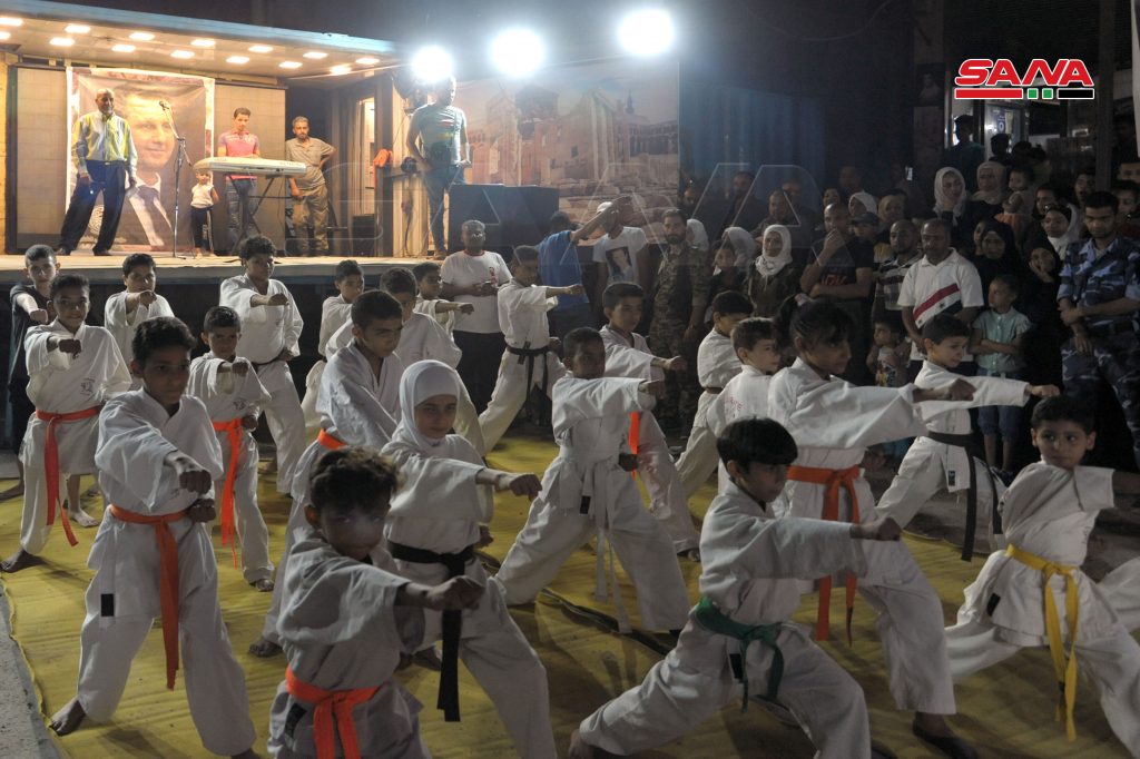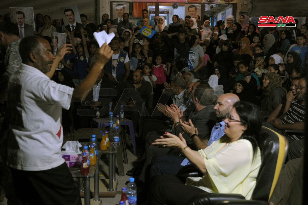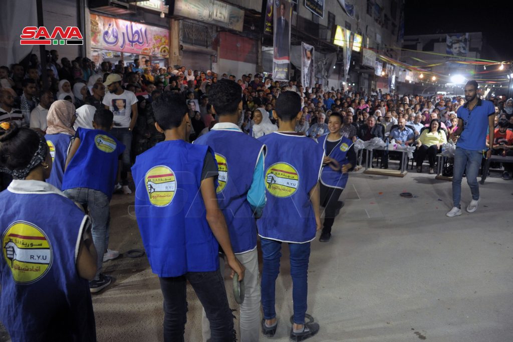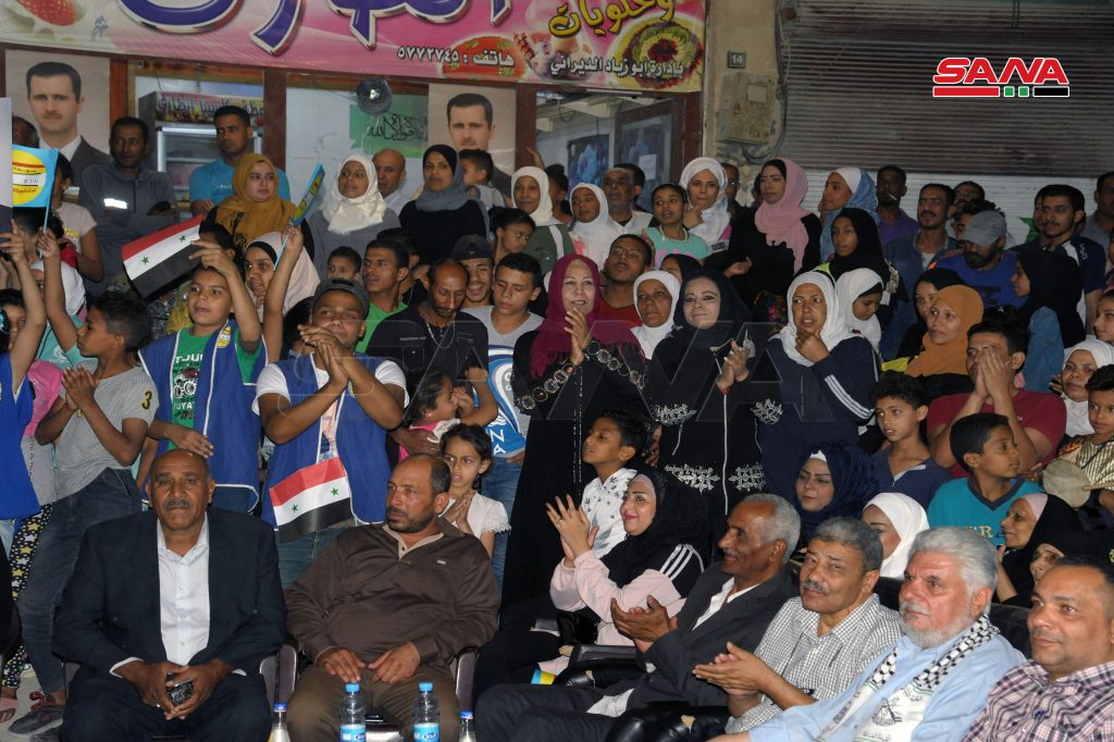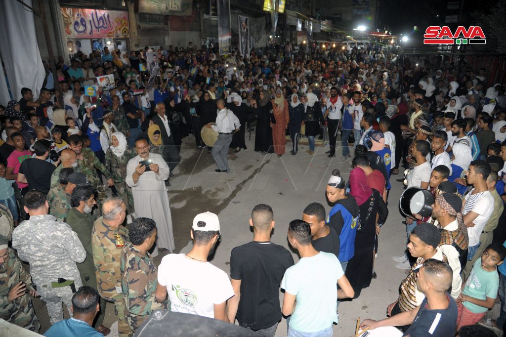 وحمل المشاركون في التجمع الأعلام الوطنية وصور الرئيس الأسد وهتفوا فرحاً بالنصر مؤكدين أنهم اختاروا المرشح الأجدر القادر على قيادة سورية إلى بر الأمان كما تم خلال التجمع تقديم فقرات فنية ورياضية.