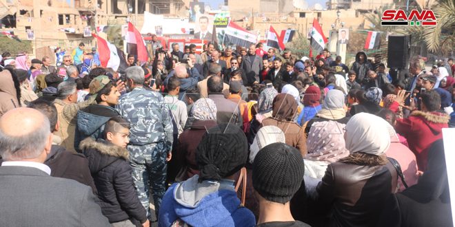 وأكد المشاركون في التجمع أن انتصارات الجيش على الإرهاب في ريف حلب تؤكد للعالم أجمع أن سورية لن تتخلى عن أي شبر من أراضيها وأن جيشها مستمر في الدفاع عن أرضه حتى تحرير آخر شبر منها من رجس الإرهاب.
