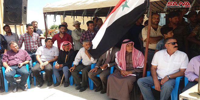 ورفع المشاركون في التجمع أعلام الوطن مرددين الهتافات التي تحيي الجيش العربي السوري الذي يحقق النصر تلو الآخر على المجموعات الإرهابية المرتبطة بالكيان الصهيوني ويعيد الأمن والأمان إلى القرى التي عانت من ويلات وجرائم الإرهابيين.