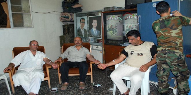 دعما لجرحى الجيش العربي السوري وتقديرا لتضحياتهم في الذود عن الوطن وتأكيداً على الوقوف إلى جانب سورية في مواجهة الإرهاب نظمت رابطة عمال فلسطين بحماة بالتعاون مع مديرية الصحة ومركز نقل الدم وفعاليات اجتماعية وأهلية واقتصادية وطلابية بحماة اليوم حملة تبرع بالدم تحت عنوان “الدم الفلسطيني والسوري واحد”.