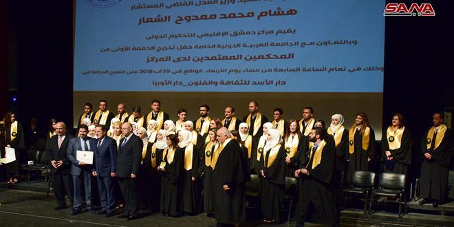 أقيم اليوم حفل تخريج الدفعة الأولى من المحكمين المعتمدين لدى مركز دمشق الإقليمي للتحكيم الدولي على مسرح الدراما في دار الأسد للثقافة والفنون بدمشق.