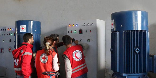زود الهلال الأحمر العربي السوري محطة ضخ الأشعري لمياه الشرب بدرعا بخمس مضخات عمودية جديدة مع كامل تجهيزاتها الكهربائية.