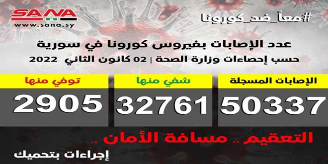 وأوضحت الوزارة في بيان تلقت سانا نسخة منه أن عدد الاصابات المسجلة في سورية بلغ حتى الآن 50337 شفيت منها 32761 وتوفيت 2905 حالة.