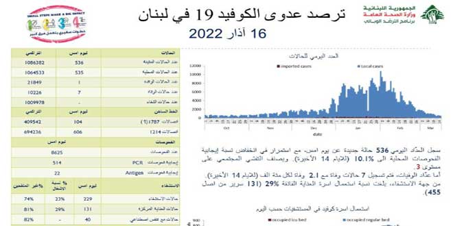 وذكرت وزارة الصحة اللبنانية في تقريرها اليومي أن العدد الإجمالي للإصابات بالفيروس في لبنان ارتفع إلى 1086382 إصابة بينما بلغ مجموع الوفيات 10226 وفاة.