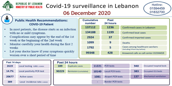 أعلنت وزارة الصحة اللبنانية تسجيل 1236 إصابة جديدة بكورونا خلال الساعات الأربع والعشرين الماضية ما يرفع إجمالي الإصابات إلى 137112.