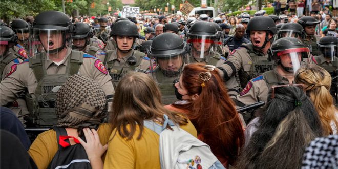 ومساء الأربعاء الماضي تم إيقاف أكثر من مئة متظاهر قرب جامعة “إيمرسون كولدج” في بوسطن… وعلى بعد آلاف أميال أوقف عناصر أمن يمتطون جياداً طلاباً في جامعة تكساس في مدينة أوستن.