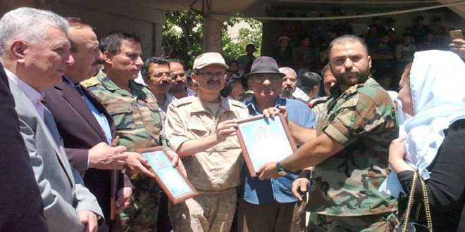 وأعرب محافظ السويداء عامر العشي عن شكر وتقدير المحافظة لهذه المبادرة من مركز المصالحة الروسي والمجموعة العملياتية الوطنية لتكريم أسر شهداء هذه القرية الذين ” ضحوا بأرواحهم الطاهرة دفاعا عن الوطن منوها بعمق علاقات الصداقة والتنسيق والتعاون بين سورية وروسيا على مختلف المستويات والمجالات وبوقوفها مع باقي الأصدقاء إلى جانب الشعب السوري اليوم في مواجهة الإرهاب الدولي حتى تحقيق النصر وتطهير ارض الوطن من رجسه”.