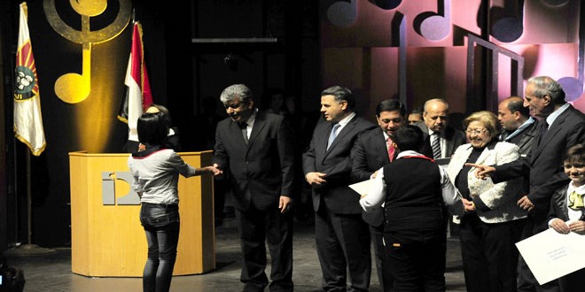 وتضمن حفل الختام أغنية “رسالة من الأطفال إلى العالم” من كلمات عيسى الضاهر والحان وتوزيع موسيقي نزيه أسعد أداها كورال الأطفال إضافة إلى فقرات فنية وغنائية ولوحات راقصة عبرت عن حب الوطن وصمود الشعب السوري منها أغنية “غالي غالي يا وطني” ولوحة فنون شعبية مركزية.