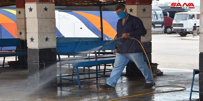 تنظيف وتعقيم مراكز الانطلاق في اللاذقية استعداداً لتنفيذ قرار السماح بالتنقل بين المحافظات