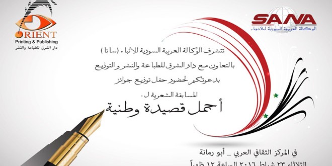 تقيم الوكالة العربية السورية للأنباء سانا بالتعاون مع دار الشرق للطباعة والنشر والتوزيع عند الساعة الثانية عشرة من ظهر يوم الثلاثاء القادم حفلا لتوزيع الجوائز على الفائزين بمسابقة أجمل قصيدة وطنية كتبت