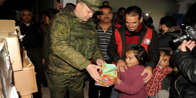 وقال ممثل مركز التنسيق الروسي في حميميم بالمنطقة الجنوبية العقيد يوري في تصريح صحفي.. إن “الهدايا مقدمة من اطفال روسيا لاطفال سورية وتضم ألعابا قرطاسية وادوات رسم وتلوين وحلويات وذلك بمناسبة أعياد الميلاد وراس السنة” مضيفا أن “روسيا مستمرة في تقديم المعونات الانسانية إلى المواطنين في سورية”.