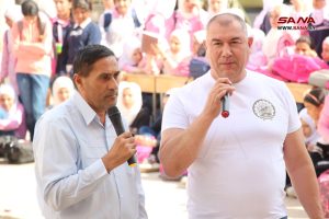 في إطار أعمال الاجتماع الخامس السوري الروسي المشترك لمتابعة المؤتمر الدولي حول عودة اللاجئين والمهجرين السوريين، قدم وفد روسي برئاسة أريت ساغيتوف نائب رئيس حكومة إشكيريا في روسيا الاتحادية، مساعدات تعليمية ورياضية متنوعة، خلال زيارته لمدرسة الشهيد إسماعيل أبو نبوت في درعا.