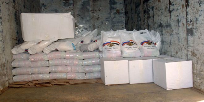 ولفت ممثل مركز التنسيق الروسي في حميميم المقدم فيتالي في تصريح للصحفيين إلى أن المساعدات “تتضمن مواد غذائية أساسية من سكر ورز وحليب ومعلبات”.