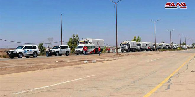 أوصل فرع الهلال الأحمر العربي السوري بدرعا قافلة مساعدات إنسانية إلى مدينة بصرى الشام وبلدة زيزون بريف درعا.