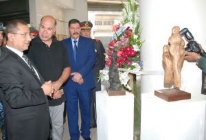 الفنان الشاب سامي إبراهيم الذي قدم منحوتة بعنوان “لحظة ارتقاء الشهيد” بين أنه استخدم لإنجاز عمله مادة البولستر وجسد عبرها رفض الشهيد للموت لأنه يريد الاستمرار في الدفاع عن الوطن وفي الوقت نفسه تمسك الأرض به لأنه يحميها.
