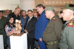الفنانة التشكيلية صريحة شاهين التي شاركت بعملين قالت “أشارك بلوحة زيتية أعبر فيها عن مبنى مجلس الشعب وخوذة الجندي العربي السوري كرمز للحرب والسلام إضافة إلى مشاركتي بعمل خزفي سميته وقفة عز أعبر فيه عن تحدي جنودنا البواسل وتضحياتهم لحماية تراب الوطن” معتبرة أن إقامة المعرض في ظل هذه الظروف تذكير بأن دماء الشهداء السوريين ستظل عنوان النصر.