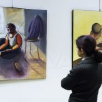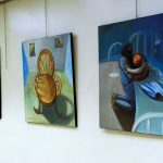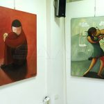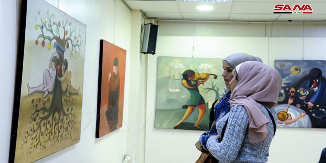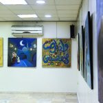 المعرض الذي تستضيفه قاعة لؤي كيالي في الرواق العربي تضمن 20 لوحة بحجم كبير بتقنية الزيتي ومواضيع تعبيرية تنوعت ما بين البورتريه والحروفية والطبيعة الصامتة والحيوانات والمشاهد الحياتية للشخوص.