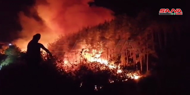 تواصل فرق الإطفاء بمؤازرة من عناصر الجيش العربي السوري إخماد الحرائق في غابة جبل حمد وجنينة رسلان وزغرين بمنطقة الدريكيش في ريف طرطوس الشرقي.