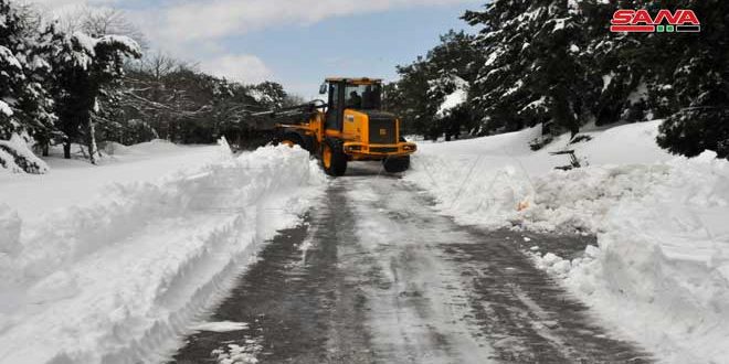 أعلنت إدارة المرور في وزارة الداخلية أن عدداً من الطرق في محافظات ريف دمشق واللاذقية وحماة والقنيطرة والسويداء سالكة بصعوبة بسبب تراكم الثلوج وتشكل الجليد.